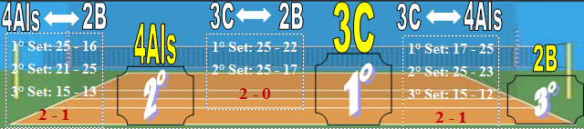Il primo match è stato disputato lunedì 7 marzo tra 2B e 3C e ha mostrato la forza devastante della terza, che ha vinto entrambi i set (25-22 e 25-17), lasciando così poche speranze di vittoria per la seconda. Il secondo match si è svolto lunedì 11 e vede affrontarsi 4Als e 2B: sono stati necessari 3 set, il primo vinto dalla 4Als (25-16), il secondo dalla 2B che si riscatta della falsa partenza (21-25) e il terzo vinto, infine, dalla 4B (15-13). La finalissima primo e secondo posto si è svolta lunedì 17 marzo: le classi 3C e 4Als si sono affrontate valorosamente regalando un match imperdibile e pieno di colpi di scena.