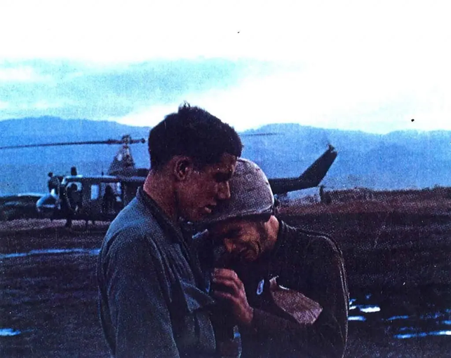 Quella liberazione che, secondo il reporter italiano, significa la gioia di essere tornato salvo, lontano da quello che ha potuto vedere durante i giorni precedenti insieme ai suoi compagni, che purtroppo non ce l’hanno fatta. Ma quel pianto, lungo e doloroso, è la sofferenza che porterà per il resto della vita, ricordandosi di tutto ciò che ha visto in quelle colline vietnamite. Anche il reporter è scioccato e rattristato quasi  quanto lui. L’inviato apparentemente  sta annotando profondamente nel suo cuore quello che sta succedendo: tiene bene appoggiato il capo e le braccia del militare sul suo petto, guardandolo e fissando allo stesso tempo il vuoto, provando a immaginare l’inimmaginabile, ovvero tutto ciò che ha vissuto in prima persona quel soldato.